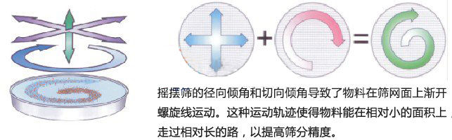物料在圓形搖擺篩篩面上從中心到外圍擴(kuò)散,物料均勻在篩面上做跳躍旋轉(zhuǎn)的螺旋運(yùn)動(dòng),無法篩分到下層的物料會(huì)在該層面的出料口排出,直至所有物料篩分完畢。工作任務(wù)結(jié)束。